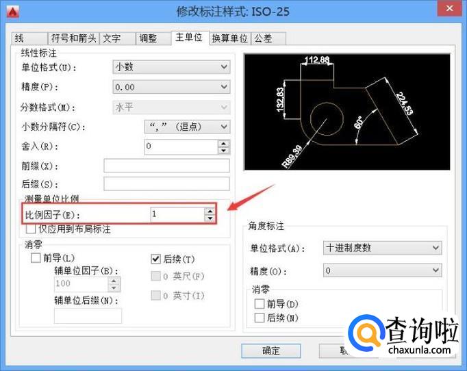 点击修改选项在其设置界面内找到主单位选项,点击该选项在其内找到比例因子选项,我们根据需要就可以设置标注的比例了,如图所示: