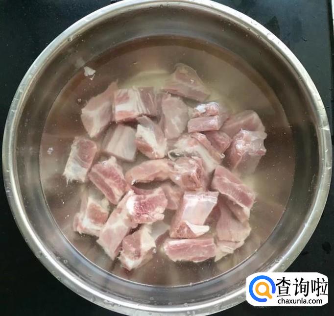 斩成块的排骨放入容器中加入足量的清水浸泡两个小时左右去一下血水,期间要勤换几次水