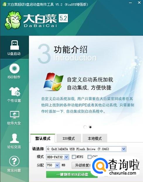 首先,我们要先把普通U盘制作成启动盘,网上有很多的制作工具,我用的是大白菜版本,下载安装完成后,先插上U盘,再打开软件,检测到U盘后,点下面的“一键制作USB启动盘”,很快就会制作完成。然后把提前下载好的系统镜像复制到启动U盘上。