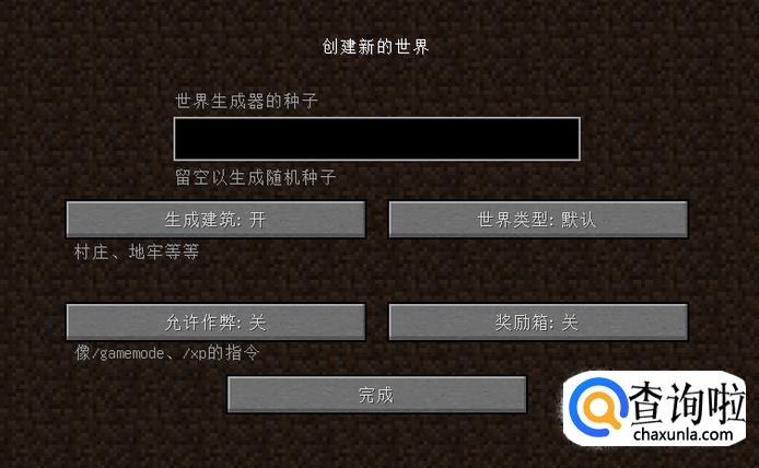 在选择创建一个新的世界之后,会随机生成一段代码,之后所有世界内地形的生成都会基于这段代码,而这段代码就是种子(Seed)。Beta1.3版之后,作者在地图创建时增加了自定义种子代码的输入框,使我们能通过输入特定种子代码来生成特定的世界环境,见下图: