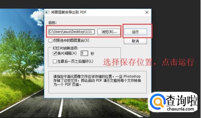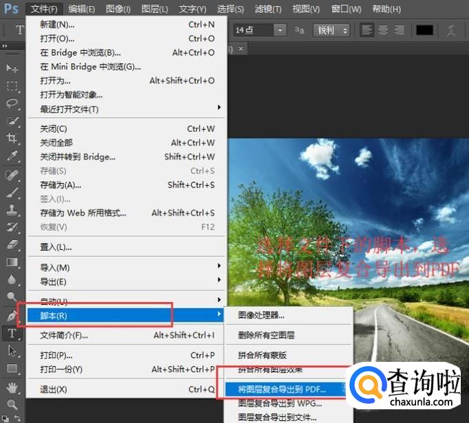 首先将图片导入进PS,点击文件菜单,选择脚本下面的将图层复合导出到PDF选项