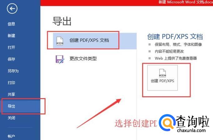 接着点击左侧的导出,选择创建PDF/XPS文档,点击右侧的创建按钮