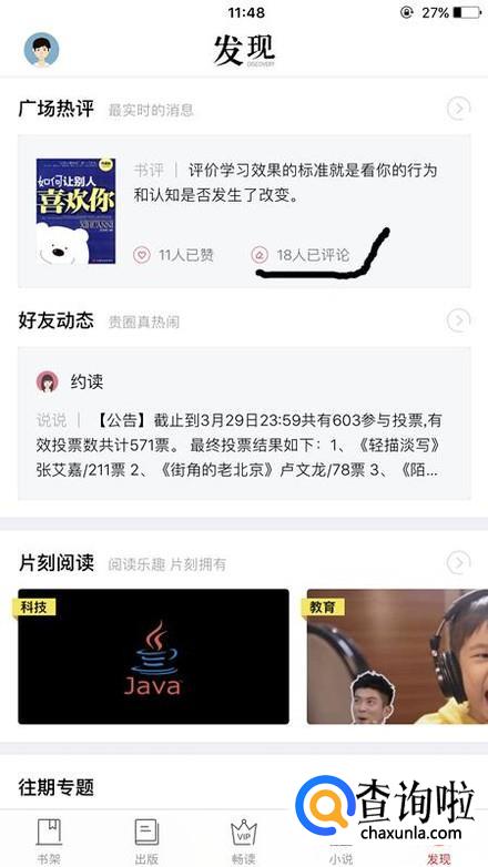 最后点击主界面中的发现,然后点击评论,对于一些文章或者书进行评论,这时候也能获得相应的积分。