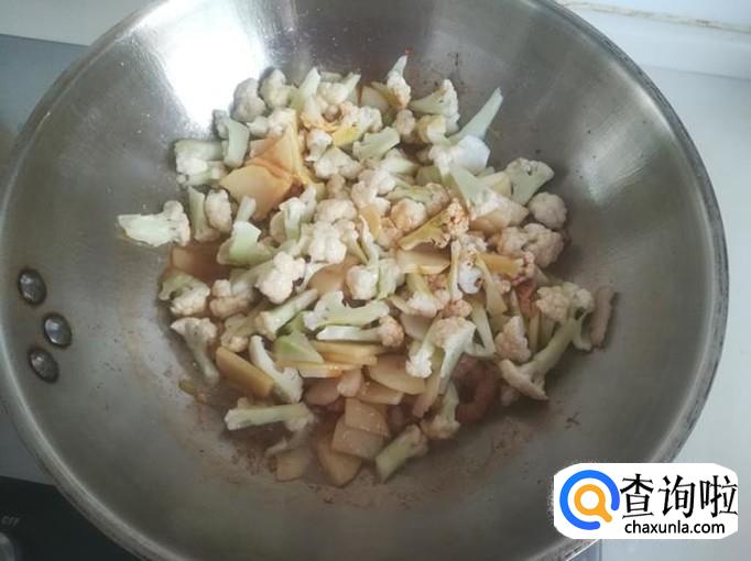 再把花菜入锅与土豆片同炒。