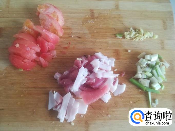 把猪五花肉切成条,葱切葱花,姜蒜切成末,西红柿切成块。