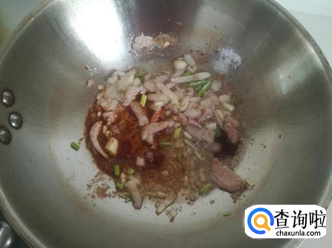 炒锅里倒入适量葵花油,等油热到六成时,把肉片下锅炒至变色,再加入葱姜蒜盐酱油,蚝油炒出香味。