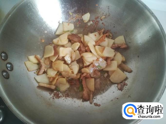 再把土豆片入锅翻炒,加少许清水,焖一下,让土豆片快熟。