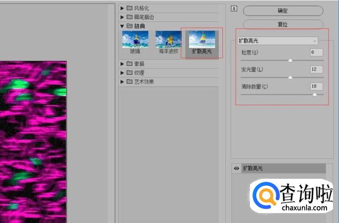 执行图像-调整-色相/饱和度命令,参数如图所示;添加扩散亮光滤镜效果,参数如图所示。
