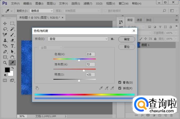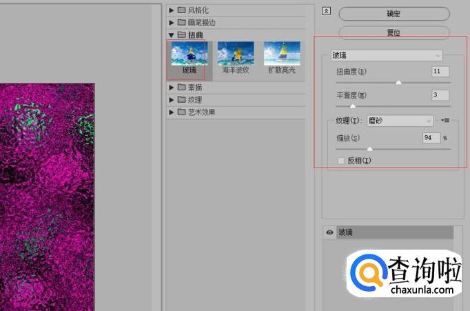 添加玻璃滤镜效果,参数如图所示;执行图像-调整-色相/饱和度命令,参数如图所示