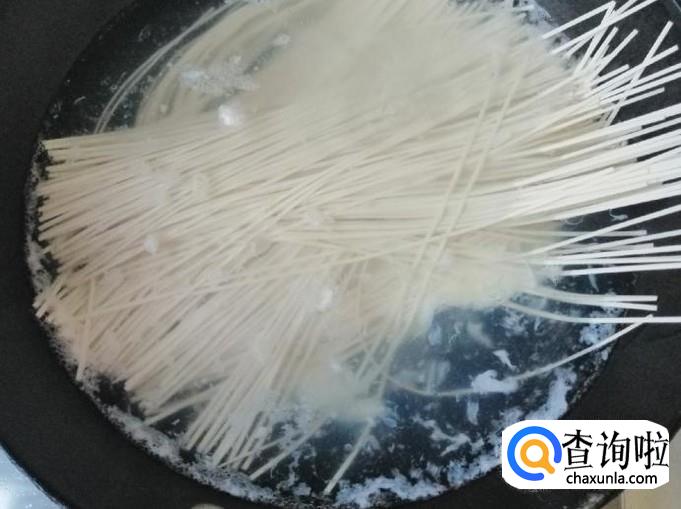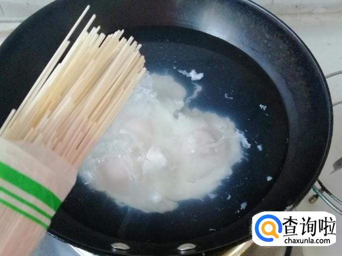 鸡蛋都入锅凝固后,就可以放入准备好的面条,放面条时候水也就完全烧开了,面条入锅后用筷子划散,以免面条粘连影响口感。面条大概煮三分钟左右就可以放菠菜了。
