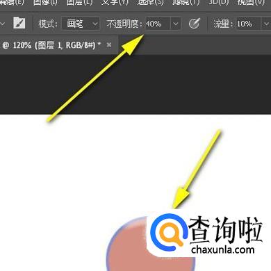 接着,再设置不透明度和流量度。可能有些朋友不明白其中的意思,我们来实操下就知道了。我们把不透明度设置为40%;再去擦图像时,每擦一次,图像不是一次性就擦得干干净净的,只是擦除一点图像,需要多擦除几次才行。但如果不透明度设置为100%时,再去擦除图像,一下子就把擦除了。