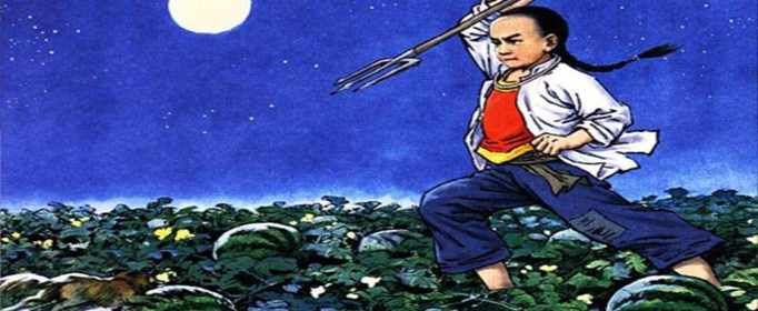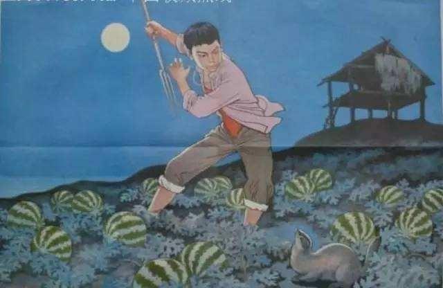 “深蓝的天空中挂着一轮金黄的圆月,下面是海边的沙地,都种着一望无际的碧绿的西瓜。其间有一个十一二岁的少年,项带银圈,手捏一柄钢叉,向一匹猹尽力地刺去。那猹却将身一扭,反从他的胯下逃走了。”