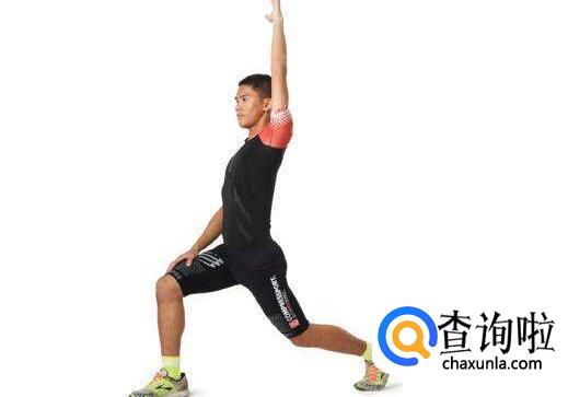 右腿在前弓步姿势,保持腰背部平直,重心向前移动,抬起左臂,向右侧倾斜,至髂腰肌中等程度牵拉感,完成15秒后换边。 - 06