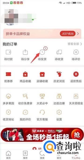 首先我们先打开拼多多的个人页面,点击待发货的选项。