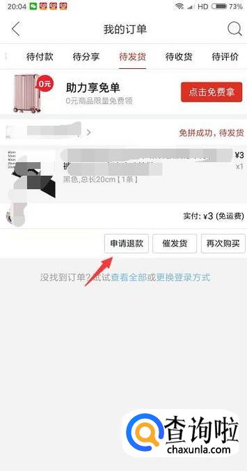 在待发货的订单下面会看见申请退款的功能,点击一下。