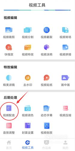 在视频工具页面的后期处理模块中,找到“视频配音”功能,点击进入视频添加页面。