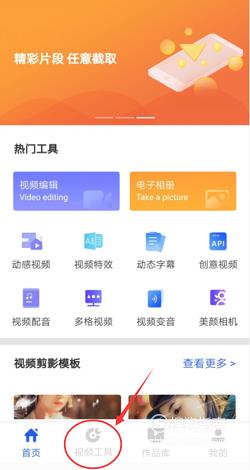 打开手机上的“清爽视频编辑器”,在首页中找到“视频工具”,点击进入视频工具页面。