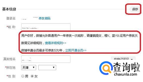 此时,我们就可以修改昵称了。但是如图所示,普通用户一年只能修改一次昵称,而会员最多可以一年修改5次,所以我们要谨慎修改。修改完成后,点击右上角“保存”按钮。