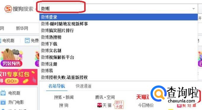 首先,我们需要进入微博,可以从搜狗网址导航首页的搜索栏搜索进入,也可以直接点击图标链接进入。