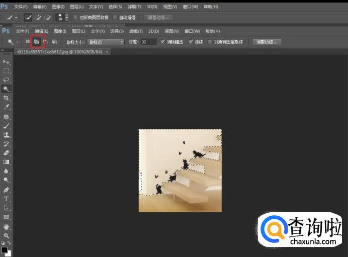 然后在图片上点击一下,会发现图片大部分已经被选中,但是不完全,此时点击图片中红色标记处,新出现的魔法棒旁会有一个“+”号,可以对区域增大选区。