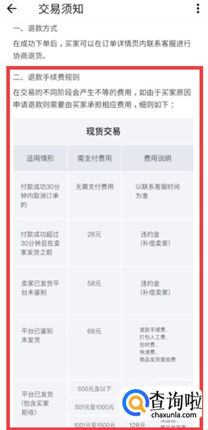 其中需要注意的是:在毒APP上退货需要给违约金。在卖家未发货前,需支付28元违约金;卖家已发货平台未鉴别需支付58元违约金;平台正在或者已鉴别未发货,需支付鞋类60元,其他物品65元的查验鉴别服务费及打包物流服务费;平台已发货需支付鞋类89元,其他物品99元的查验鉴别服务费及打包物流服务费。