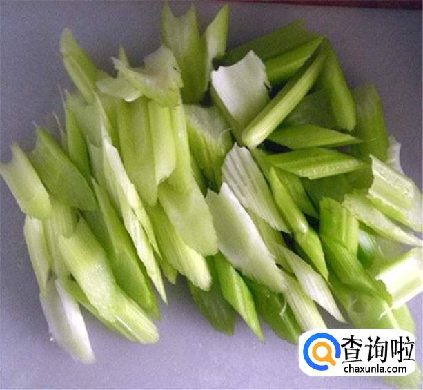 选用新鲜的芹菜,把芹菜洗净,去掉芹菜叶子,这里我们只用芹菜杆,把洗好的芹菜如图切成段,要切的薄厚均匀些,这样炒的时候比较容易熟,把芹菜切好备用。