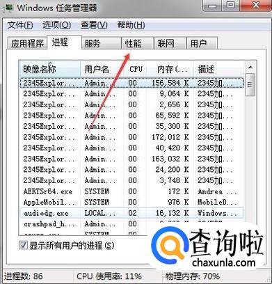 此时电脑桌面会弹出【任务管理器】对话框,接着点击【性能】按键。