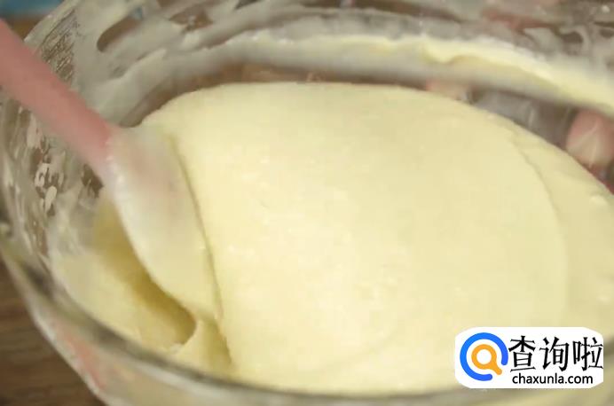 接着,在搅拌好的碗中继续加入200克低筋面粉、55克糖、8克泡打粉和适量的盐,再次搅拌,直至均匀为止。搅拌出来的样子如图所示。