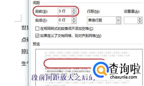 段前间距和段后间距系统默认的初始值一般都是0,如果想要扩大这一段落与上一段落之间的距离,那么将段前间距的数值调大即可,调整与下一段落的间距,就是更改段后间距的数值;