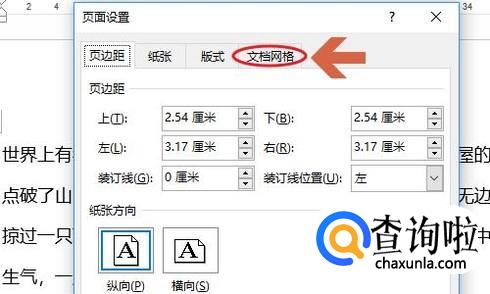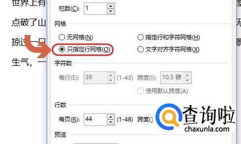 这样就弹出了页面设置对话框,我们勾选最上方的“文档网格”,可以看到目前网格类型一般为“只指定行网格”,见图二...