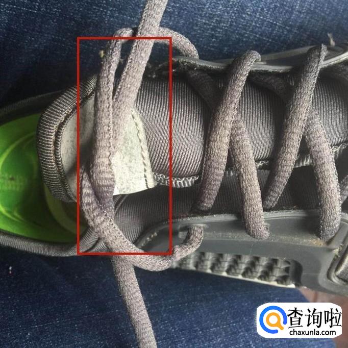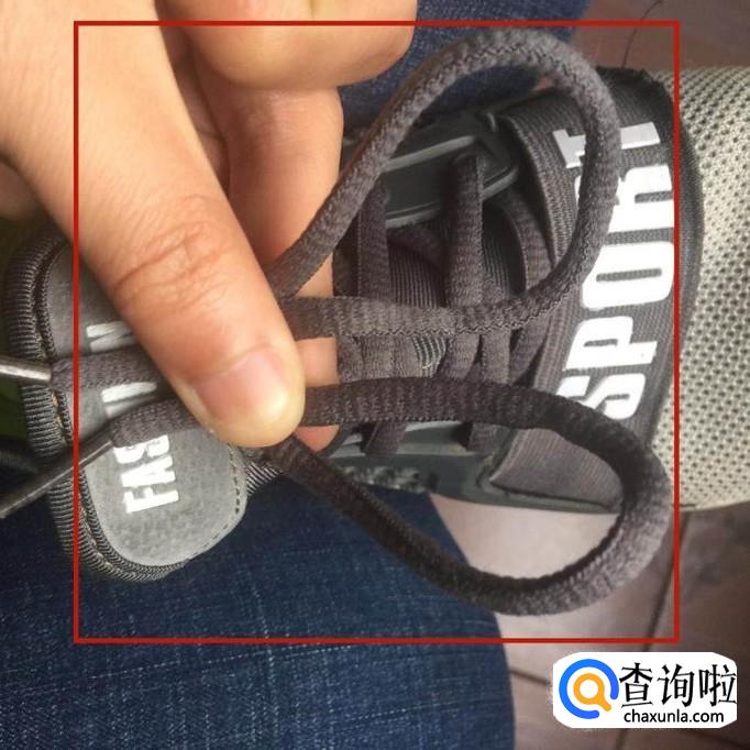 接着将鞋带一头穿入另一头下方稍微拉紧。
