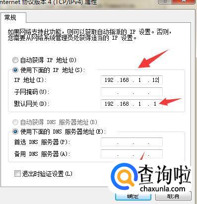 将IP地址设置为192.168.1.X,X是不为1且小于255的数字,这里设置的是12。子网掩码默认不用填,默认网关一定要填成192.168.1.1,点击确定