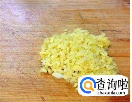 生姜去皮,一定要去皮,因为生姜皮特别寒,然后用刀将生姜剁成很细很细的末,有榨汁机的话榨成汁也可以。