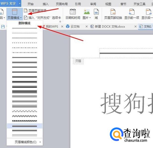 进入编辑状态后,我们点击左边上方的“页眉横线”按钮,就会展开菜单栏,我们点击“删除横线”。