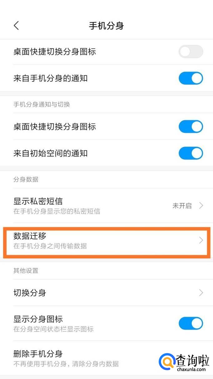 打开分身里面的“手机分身”,即可设置分身和数据迁移。