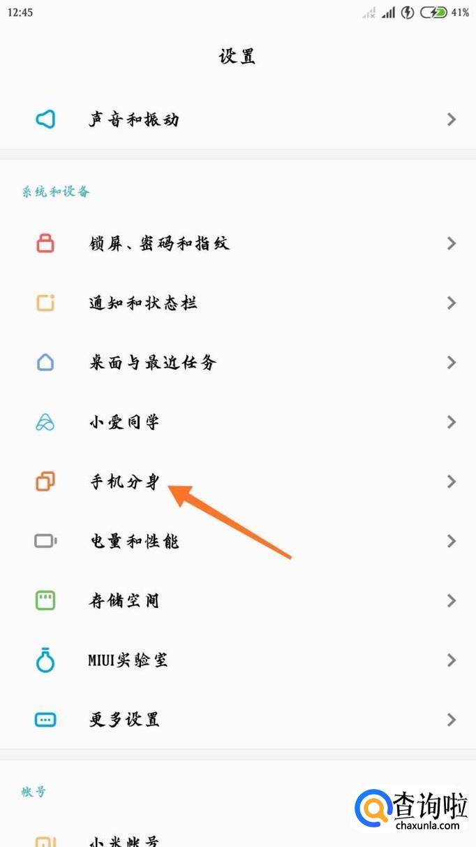 打开红米手机的设置,找到“系统和设备”里面的“手机分身”,点击打开。