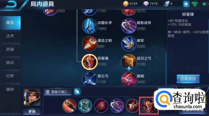 最后一件装备我们最好出碎星锤,这件装备是最近才出来的,可以加10%冷却缩减,这个是非常重要的,可以让刘备更快的使用大招。
