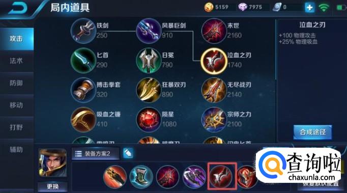 第五件装备我们需要出泣血之刃,这件装备的意义在于加25%的物理吸血,此时的刘备需要大量的吸血,这样才能对抗对方的战士英雄。