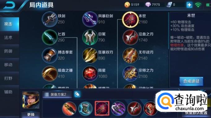 第三件装备,我们应该出末世,这件装备最重要的属性是可以加10%的物理吸血,这样可以让我们的刘备在对战中不断的吸血,非常的重要。