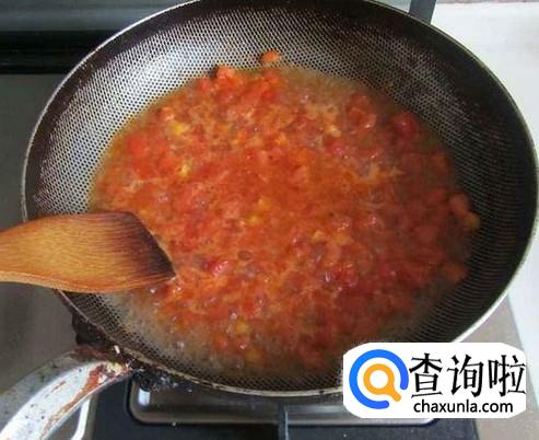 然后倒入番茄丁,翻炒均匀,调小火,把番茄丁炒出番茄汁后,加入适量的清水,大火煮,把番茄煮到烂,这样海底捞的番茄锅就做好了。