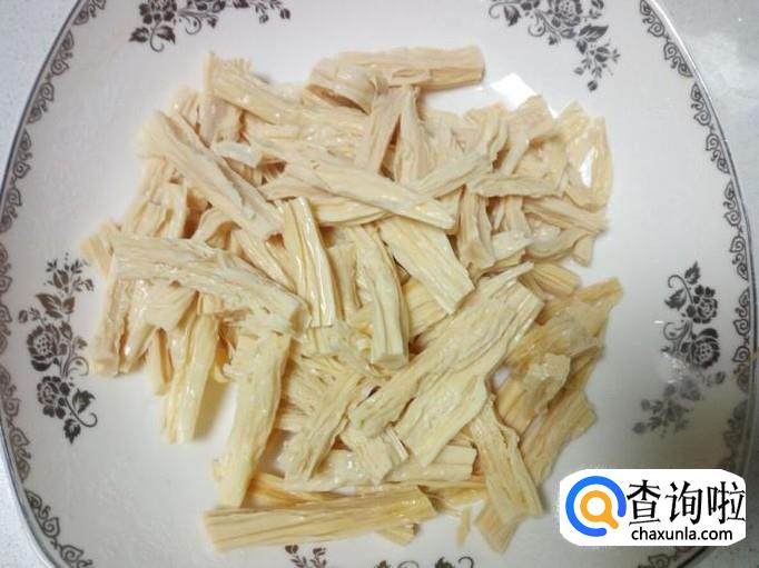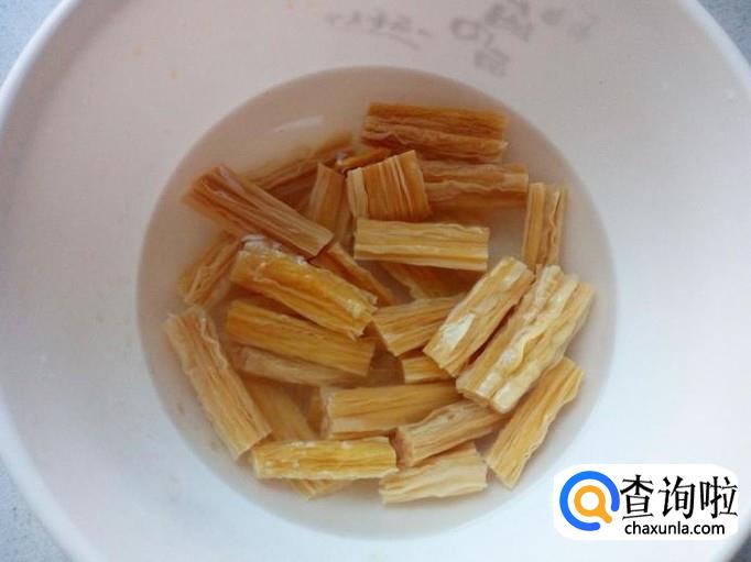 把干腐竹放入水中泡发变软,然后用水清洗干净,控干水分,切成段(我用的腐竹,泡发之前就是切好段的,如果比较宽的腐竹段,在中间劈开)。