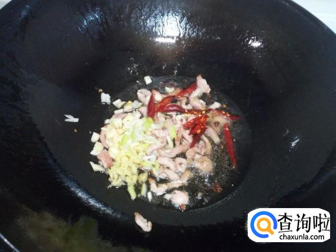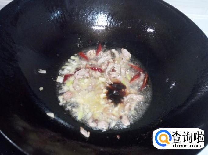 炒至肉丝颜色微白,放入红干椒,葱,姜,蒜,翻炒。放入料酒,少许蚝油。