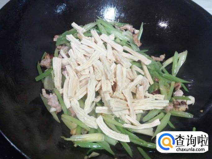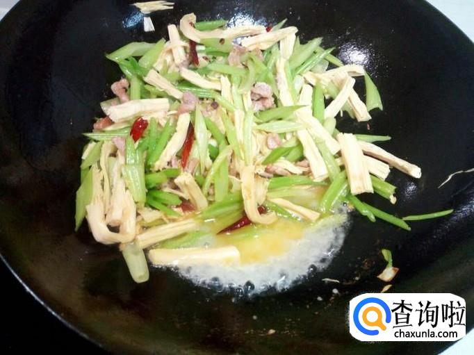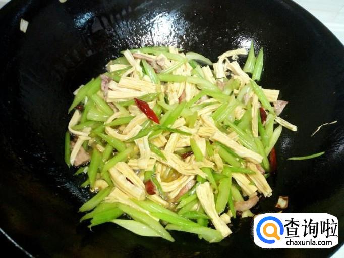 随即放入芹菜大火快速翻炒,芹菜略翻炒一下,放入腐竹翻炒,放入盐。