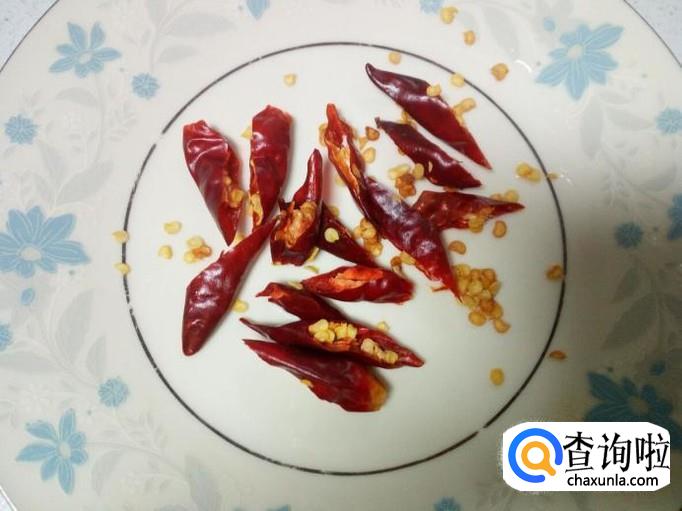 红干椒用水清洗干净,控干水分,斜刀切成段。切好葱,姜,蒜,备用。