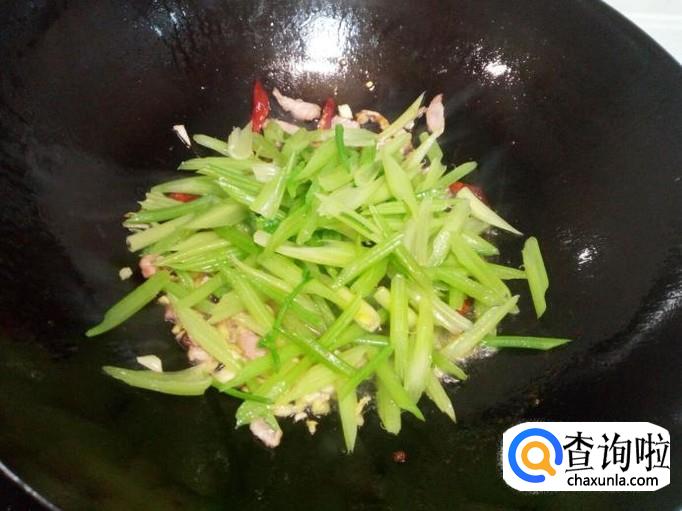 炒至芹菜断生,然后把勾兑好的芡汁倒入锅中。芡汁粘稠后,放入味精,关火出勺。