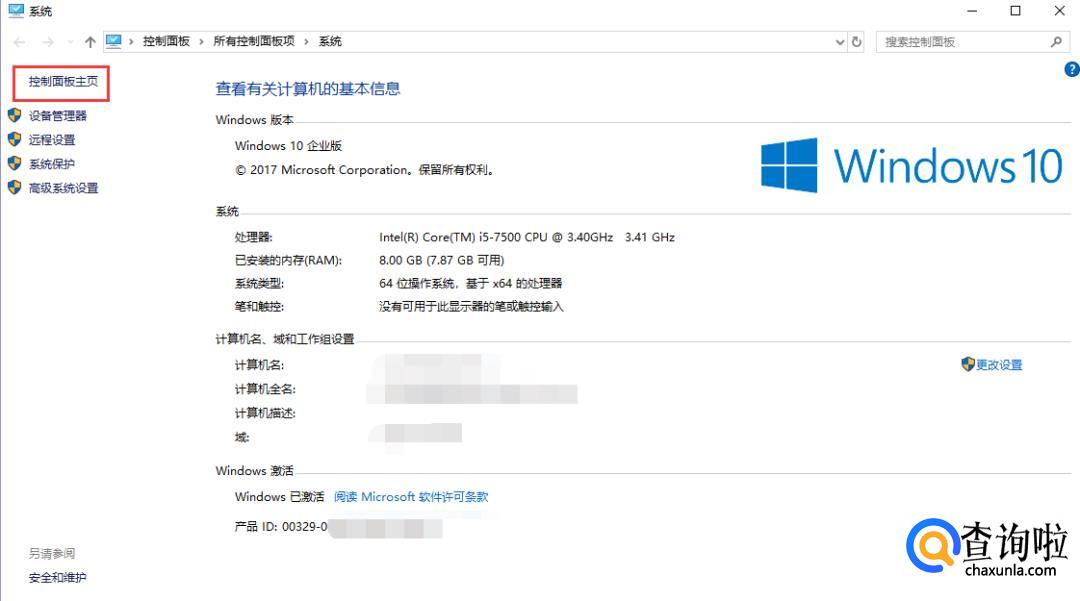 点击以后就跳出“系统”界面,在该页面的左上角找到“控制面板主页”,点击一下,然后会跳转到控制面板了。