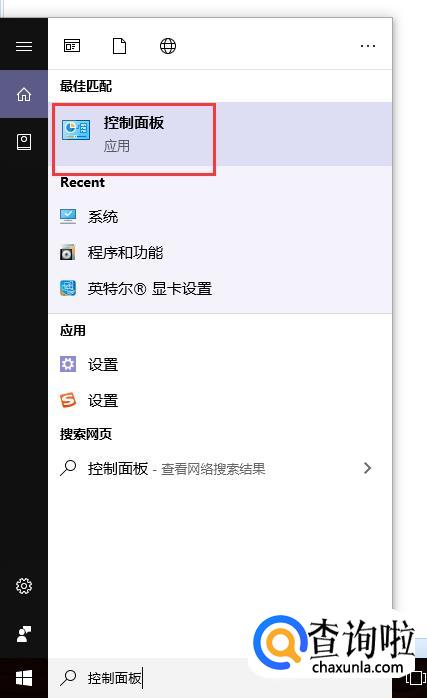方法二:在屏幕左下方的搜索框输入“控制面板”,弹出的搜索结果会显示此应用,可以之间单击鼠标左键进入。