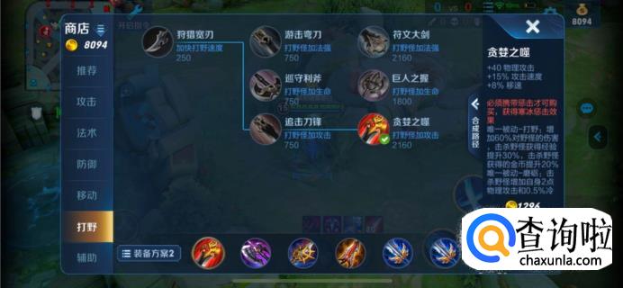 出装:贪婪之噬,唯一被动打野,增加60%对野怪的伤害,击杀野怪获得提升经验30%,增加自生2点的物理攻击。最重要的是60%的被动效果,铠在打野怪的时候暴击伤害可以超过10000。