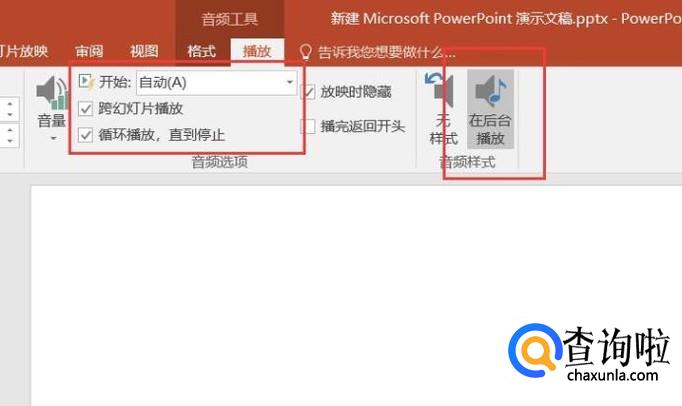 在软件页面顶部“播放”功能页面中,点击勾选“跨幻灯片播放”、“循环播放,直到停止”选项,保存对幻灯片文件的更改,即可实现在整个PPT播放的过程中,都有音乐响起。