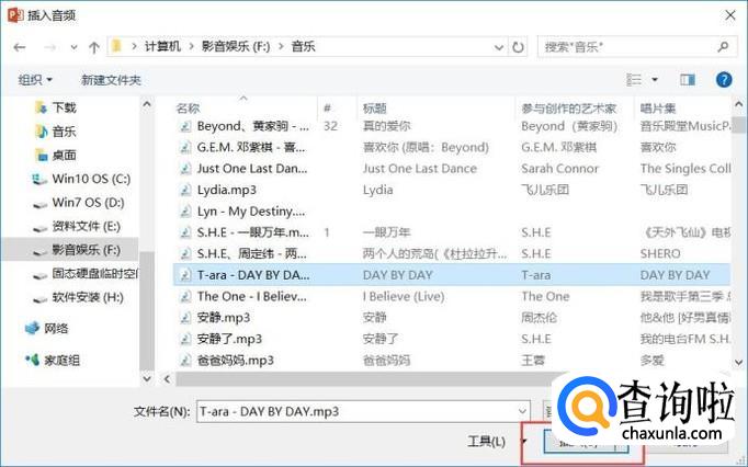 接下来,选中电脑上存储的音频文件,点击“打开”按钮即可将该音乐文件插入到PPT文件中。